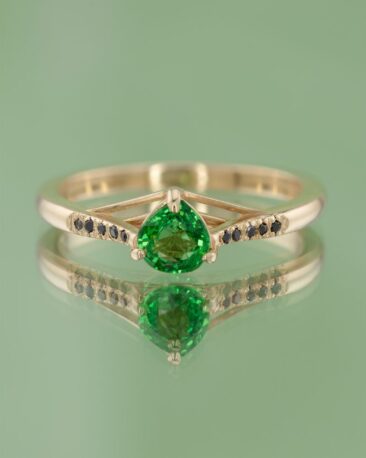 Inel Unicat JUNGLE SPIRIT cu Tsavorit Natural si 10 Diamante Negre Naturale, Aur Galben 14K