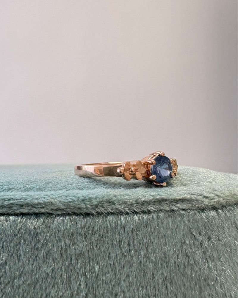 BLUE FLOWER este un inel realizat la comanda in atelierul IONA, din aur roz 14K si cu un safir natural albastru intens. Design-ul floral al monturii completeaza perfect piatra centrala, evocand delicatetea si frumusetea naturii.