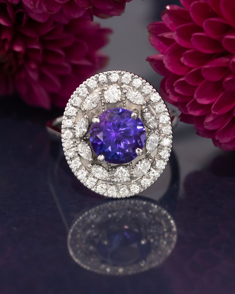 Brief-ul pe care ni l-a trimis a fost clar si simplu, iar pe baza lui am construit unul dintre cele mai frumoase inele de pana acum. In centrul design-ului am montat un Tanzanit Natural, cu nuante intense de albastru-violet, o piatra rara si extrem de apreciata pentru capacitatea sa de a reflecta lumina diferit din fiecare unghi. Tanzanitul este o piatra a claritatii mentale si a intuitiei, asociata cu echilibrul dintre ratiune si emotie.