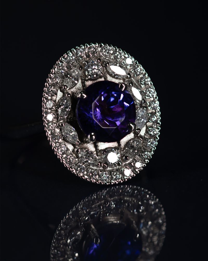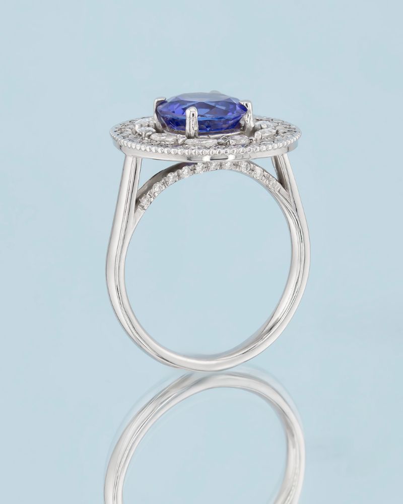 Brief-ul pe care ni l-a trimis a fost clar si simplu, iar pe baza lui am construit unul dintre cele mai frumoase inele de pana acum. In centrul design-ului am montat un Tanzanit Natural, cu nuante intense de albastru-violet, o piatra rara si extrem de apreciata pentru capacitatea sa de a reflecta lumina diferit din fiecare unghi. Tanzanitul este o piatra a claritatii mentale si a intuitiei, asociata cu echilibrul dintre ratiune si emotie.