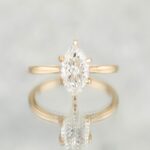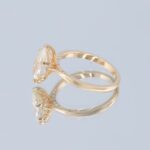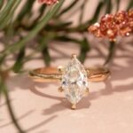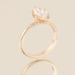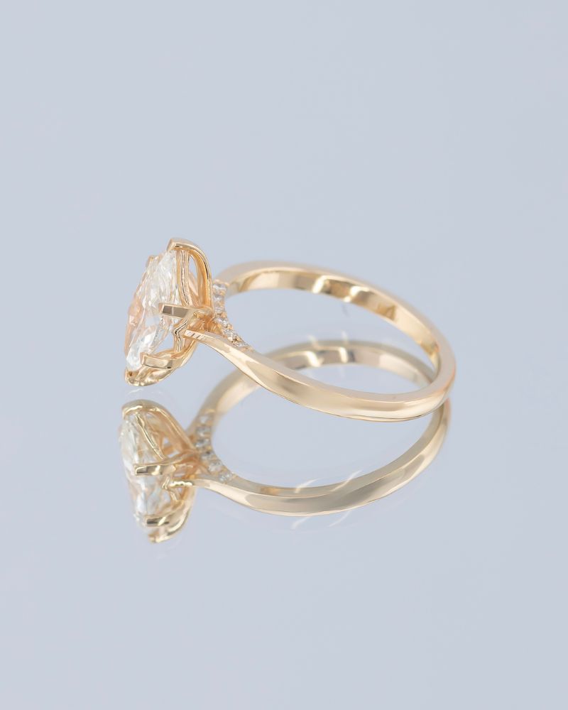 Cea mai interesanta componenta a design-ului este caseta diamantului central cu taietura Marchiza, construita cu delicatete astfel incat sa evoce forma unei flori de lotus deschise. Bratele fine ale monturii se ridica natural, asemenea petalelor, sustinand diamantul central intr-o structura aerata, eleganta si extrem de feminina. Privit din profil, inelul dezvaluie un detaliu arhitectural sofisticat – o montura care transforma diamantul intr-un fascicul de lumina, plin de rafinament.
