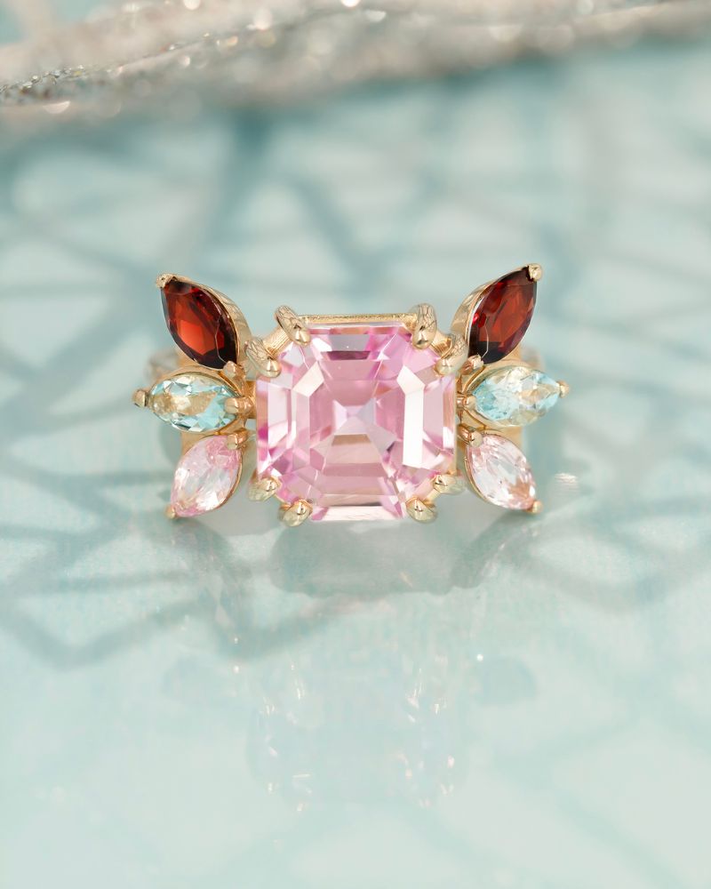 Inel TRUE COLORS cu Safire, Acvamarine, Granate Naturale si Kunzit Natural Central, Aur Galben 18K