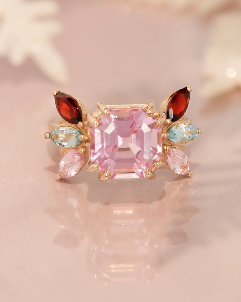 Inel TRUE COLORS cu Safire, Acvamarine, Granate Naturale si Kunzit Natural Central, Aur Galben 18K