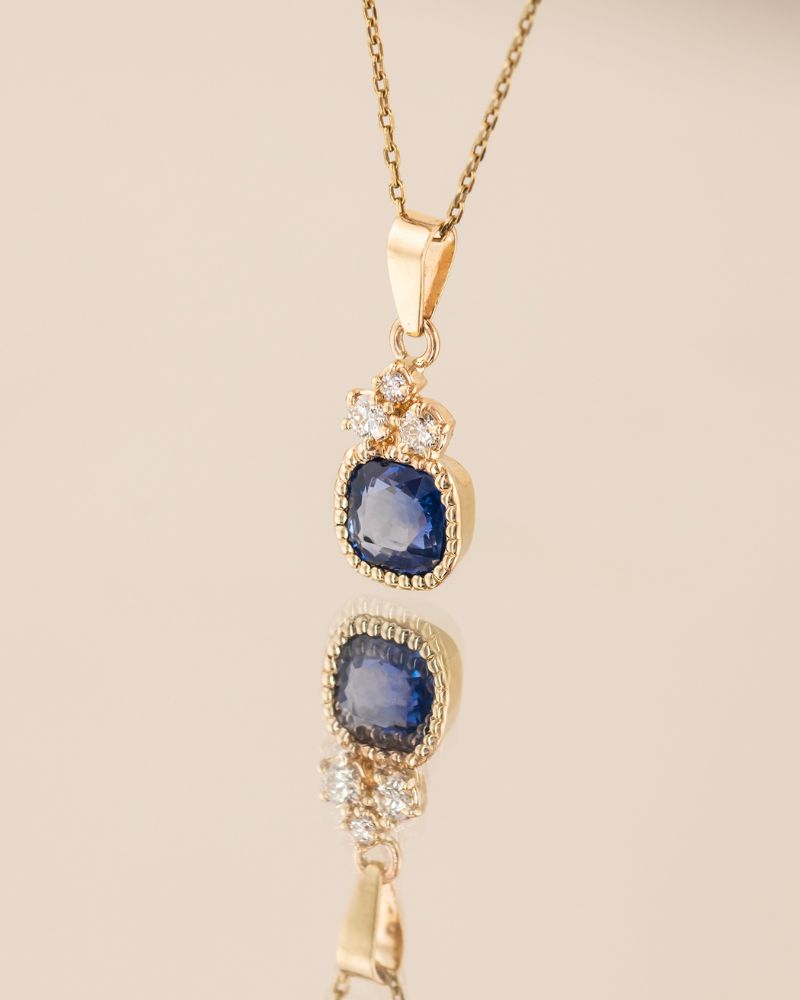 Clienta noastra si-a dorit un pandantiv din aur galben 14K realizat pe comanda cu Safir Natural Albastru, cu o taietura patratoasa si Diamante Naturale de accent. Ca sa satisfacem aceasta cerinta am folosit un Safir Natural cu taietura cushion, intr-o montura contemporana si boema, cu mici bobite de aur care inconjoara protector piatra centrala.