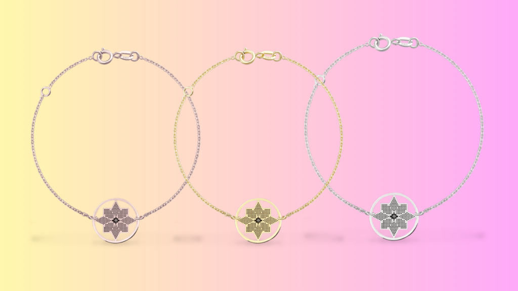 Asortam o pereche de cercei din aur alb cu design minimalist, pe lobul urechii cu un lantisor din aur alb la baza gatului si cu un mic simbol central. La fel si bratarile: tricolore, yes please! O bratara fina din aur alb pe lantisor, una din aur galben si o alta din aur roz. Toate din aceeasi colectie, cu un simbol rotund CALAUZA de purtat zi-de-zi.