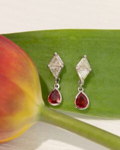 Executati din aur alb 14K, cerceii pun in dialog doua tipuri de pietre cu “personalitati” complementare: diamante si rubine naturale. Diamantele Naturale cu taietura Trilion… -
