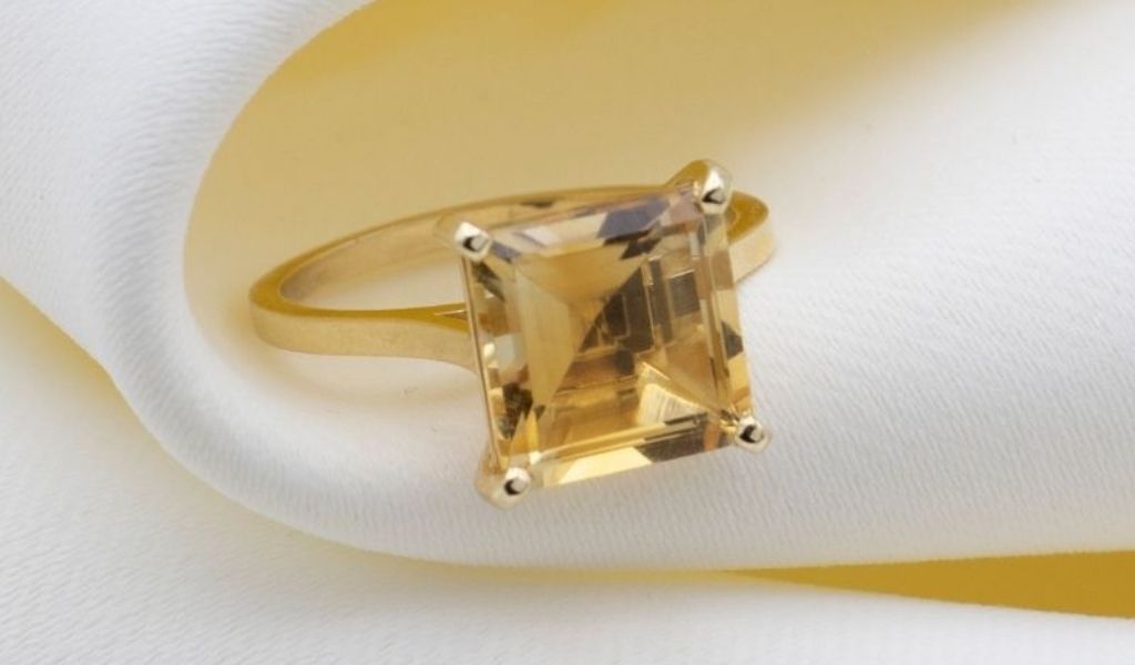 Pe aur galben, citrinul isi continua tonul solar si pare ca se topeste in metal.