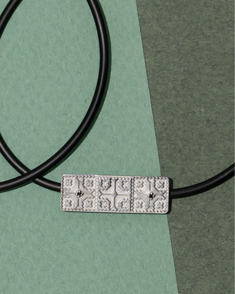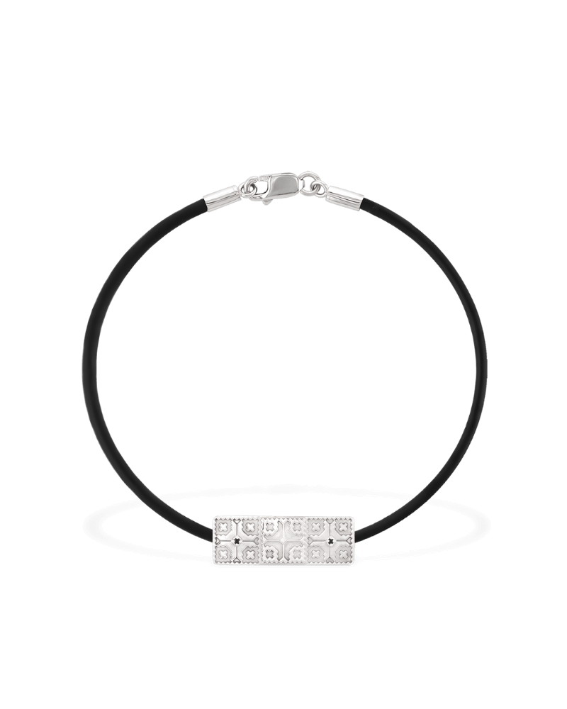 Placuta centrala este inspirata din motivele traditionale regasite in tesaturile vechi romanesti: forme geometrice repetitive si simboluri protectoare. In centru, diamantele negre naturale aduc doua puncte de contrast si echilibreaza estetic bratara, fiind exact genul de detalii care adauga personalitate unei bratari.
