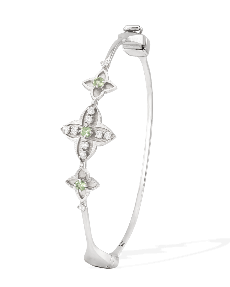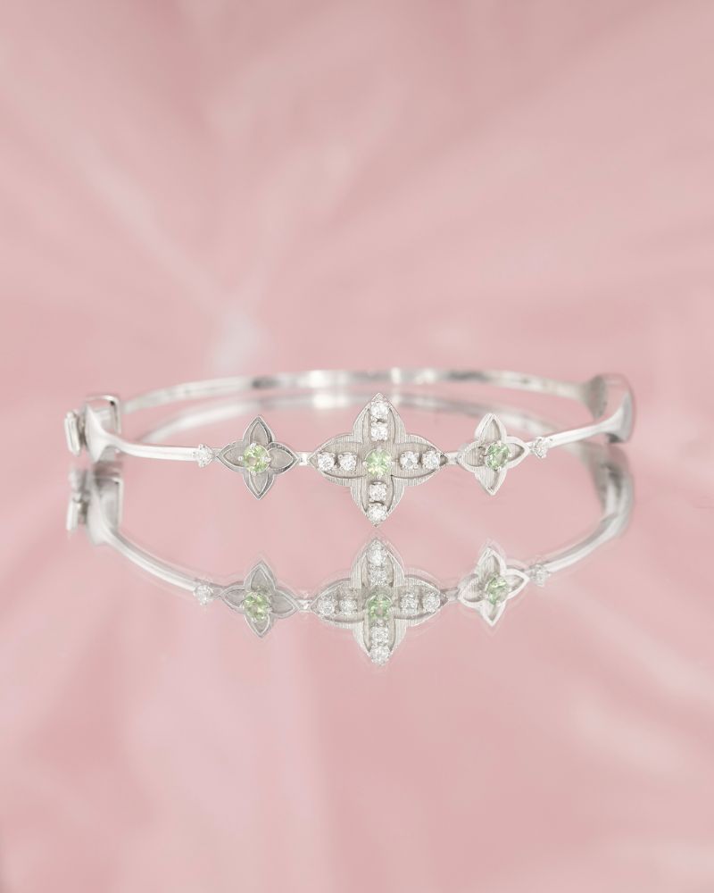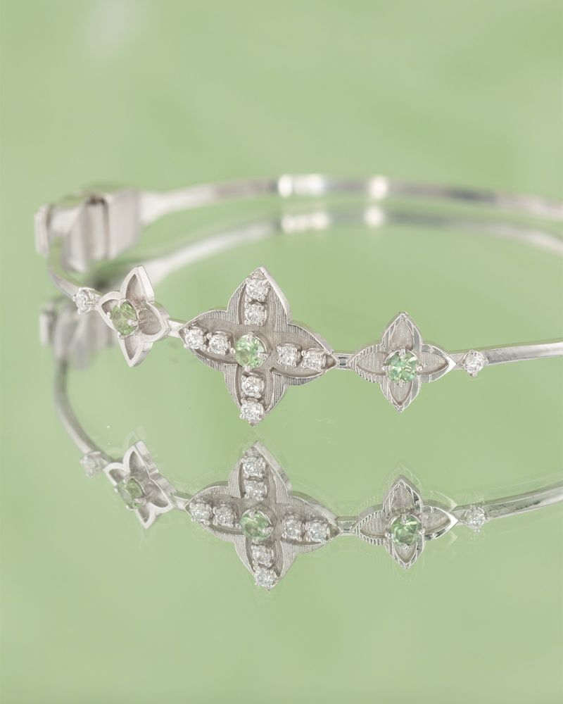 Daca iti plac bijuteriile delicate, dar rezistente si cu personalitate, te vei regasi in ritmul floral al bratarii fixe IASOMIE DE PRIMAVARA. O compozitie formata din 3 flori de iasomie stilizate cu diamante naturale si safire verzi autentice, alese pentru claritatea lor si pentru nuanta proaspata, atat de luminoasa.