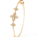 Design-ul este cochet si modern in acelasi timp. Povestea bratarii se misca in trei trepte florale, fiecare lucrata in aur 14K in nuantele tale preferate — galben, alb sau roz — cu acele micro-texturi fine care definesc stilul IONA. Fiecare safir verde este prins in centru, exact ca o picatura de primavara, iar diamantele sunt asezate pe brate pentru maximum de stralucire.
