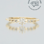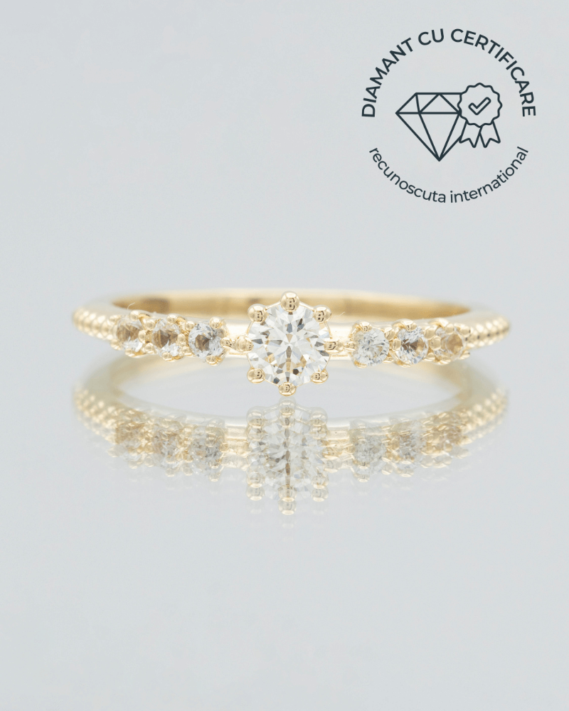 Ne-am propus sa proiectam un inel de logodna clasic, care sa surprinda esenta unei cereri in casatorie: emotii, bucurii si perspectiva unui viitor luminos impreuna. Asa ca iti aducem inelul SUNLIGHT: un diamant central, natural si 6 safire incolore, naturale, montate ca pietre de accent.