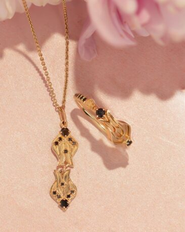 Fiecare diamant negru este setat manual in atelierul IONA, iar nuantele intense sunt puse in valoare de lumina aurului.
