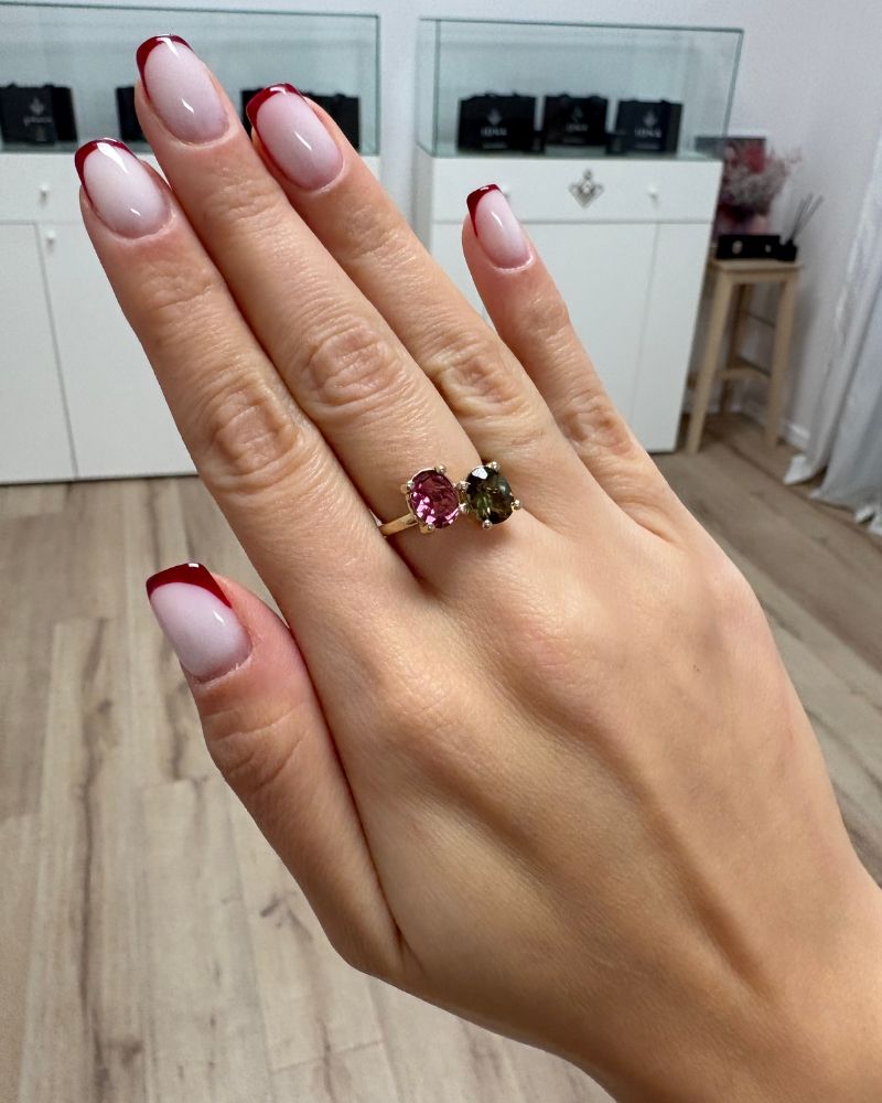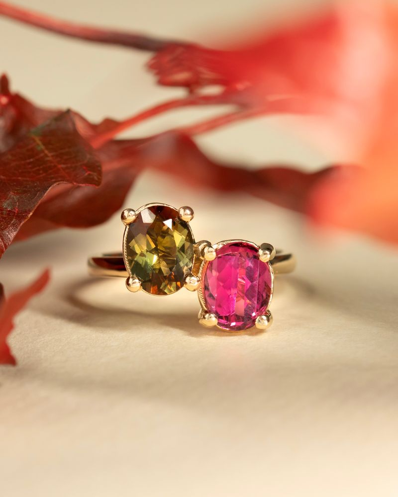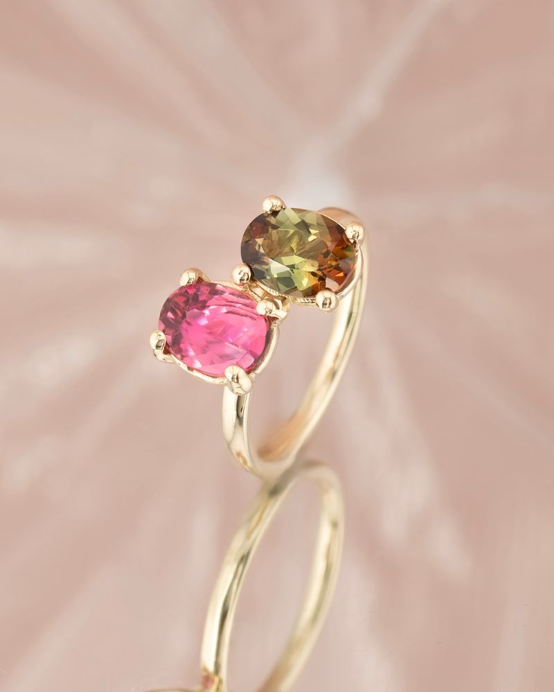 Am unit doua lumi cromatice fascinante intr-un singur inel: inelul CONVERSATION STARTER. Andaluzitul e o piatra cu efect de pleocroism, in functie de unghiul din care o privesti afisand culori si nuante diferite, iar Turmalina are o taietura fancy cu fatete unghiulare, care pun in valoare rozul vibrant al pietrei.