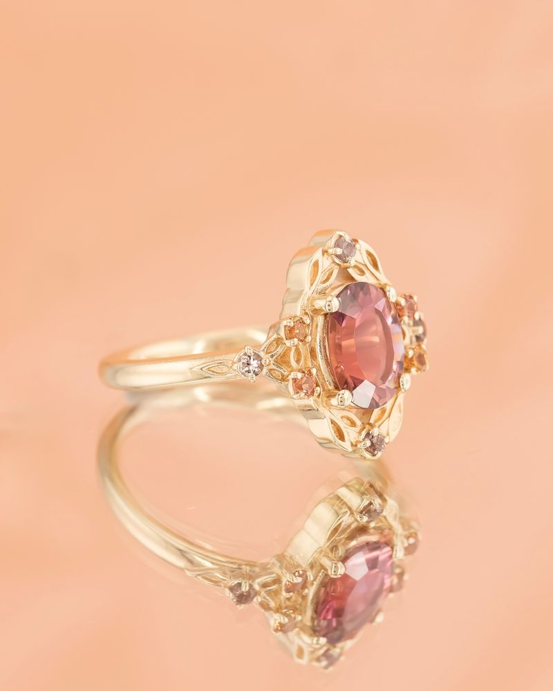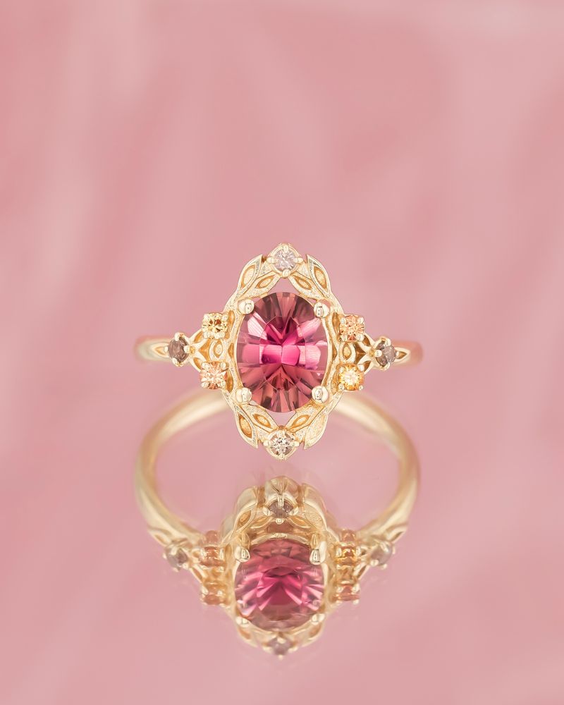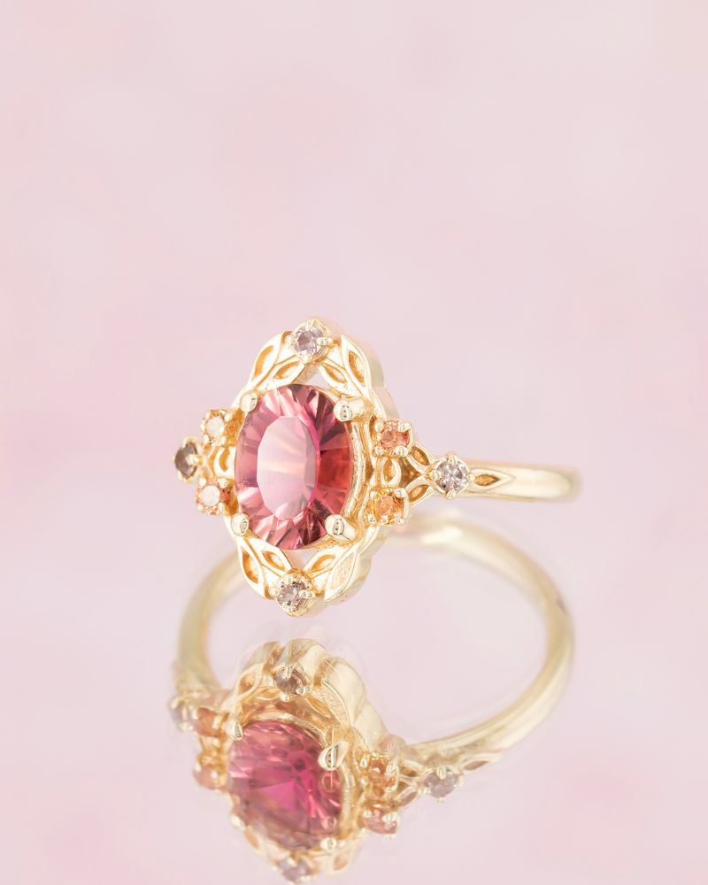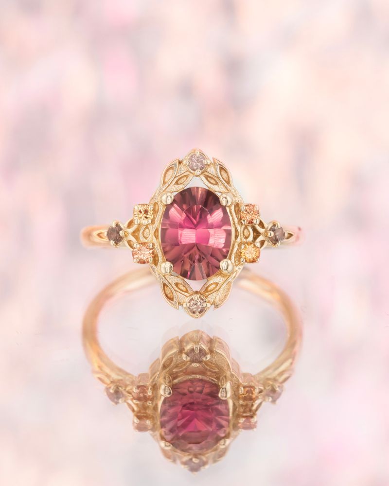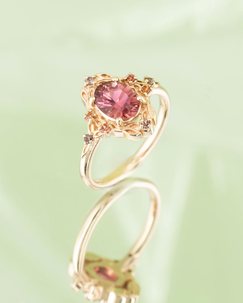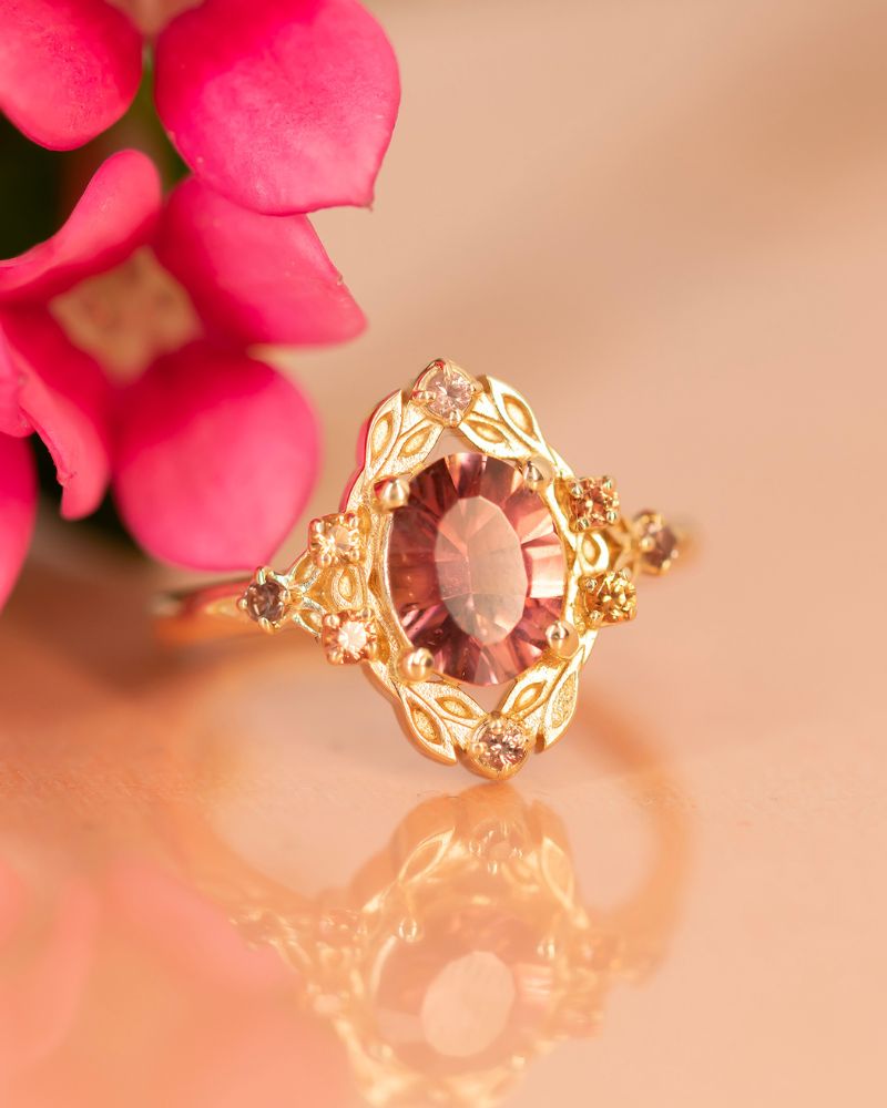 Montura este decorata cu detalii florale fine si Safire Naturale in doua nuante calde, completand perfect turmalina centrala. Rezultatul este o compozitie eleganta si echilibrata, care imbina feminitatea delicata cu forta interioara a pietrelor pretioase.