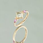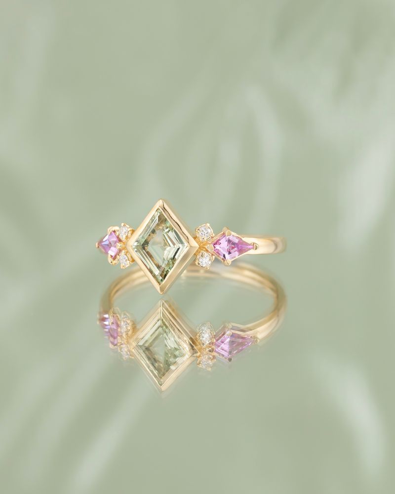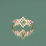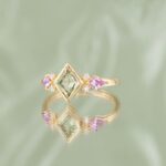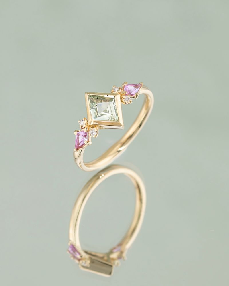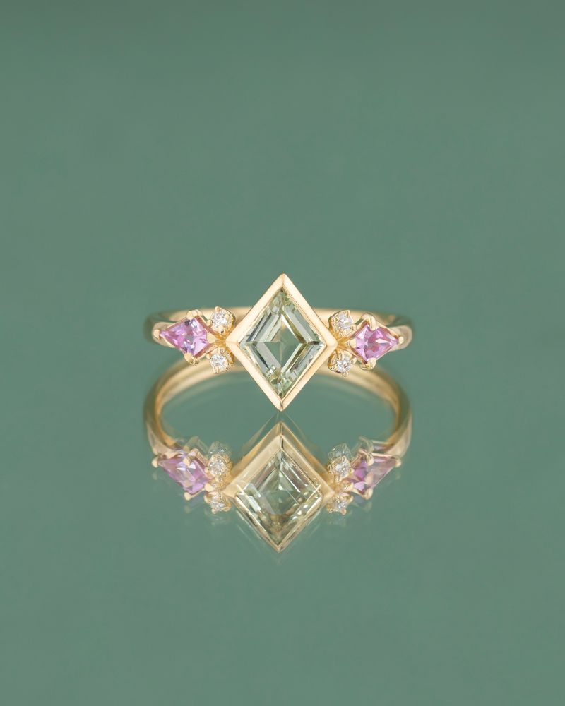 Inelul IRIS imbina forme geometrice moderne cu aceentele Art Deco, intr-o combinatie de culori calde si delicate. Piatra centrala este un Safir Natural Verde cu o taietura rara; este incadrat de doua Safire Naturale Roz in nuante luminoase si accente fine de Diamante Naturale Clasice.