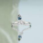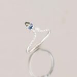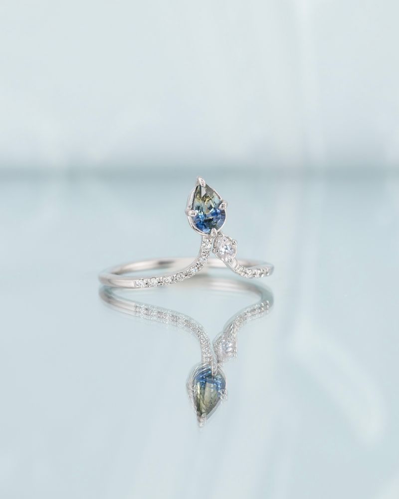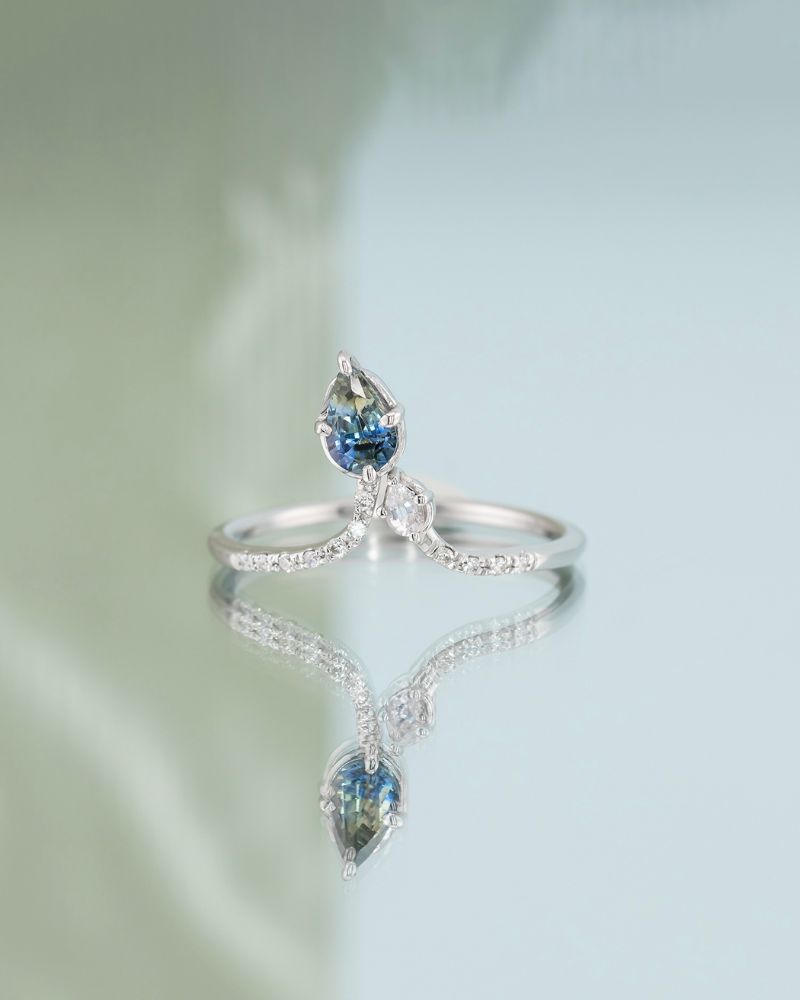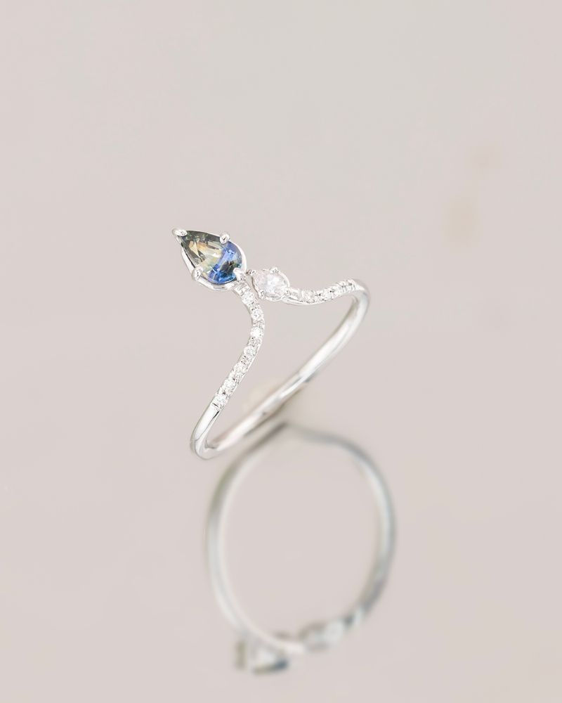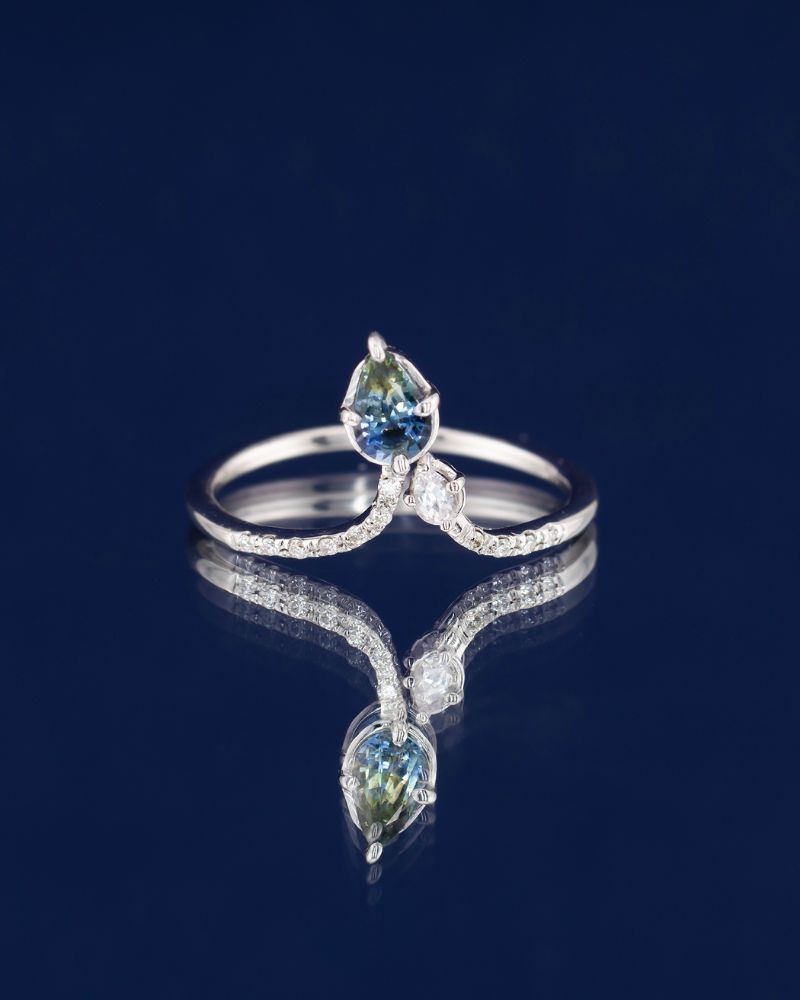 Este inspirat de steaua cea mai luminoasa, cea mai stralucitoare de pe bolta cereasca. Piatra centrala, in forma de picatura, este un Safir Natural Bicolor Albastru – Verzui, montat in aur alb 18K. Banda usor curbata este pavata cu diamante albe, adaugand stralucire fara exces.