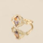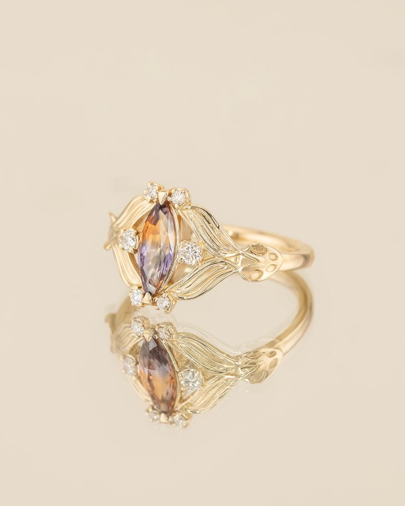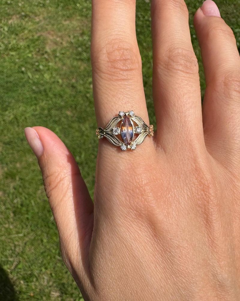 Aceasta este “piesa de rezistenta” a colectiei noastre de bijuterii unicat. In inelul VINTAGE AFFAIR am montat cel mai frumos safir natural pe care l-am vazut pana acum: un safir natural auriu – albastrui, cu nuante de burgundiu la capete.