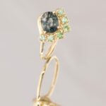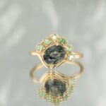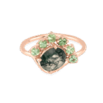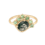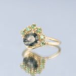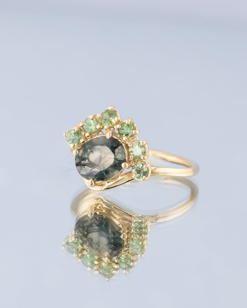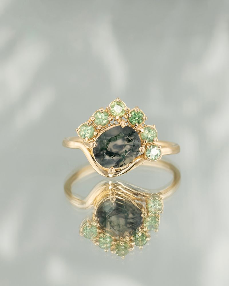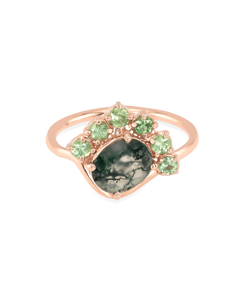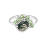WILD PEACOCK este un inel ce poarta amprenta libertatii si a frumusetii neconventionale. Agata moss, cu incluziunile sale organice, se impleteste armonios cu safirele verzi, dispuse precum coada infoiata a unui paun aflat intr-un dans al dragostei si al seductiei.