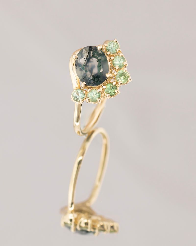 Realizat in serie limitata, acest inel este creat manual din aur de 14K. Suntem limitati in de numarul Agatelor Moss disponibile: avem doar 4 astfel de pietre.