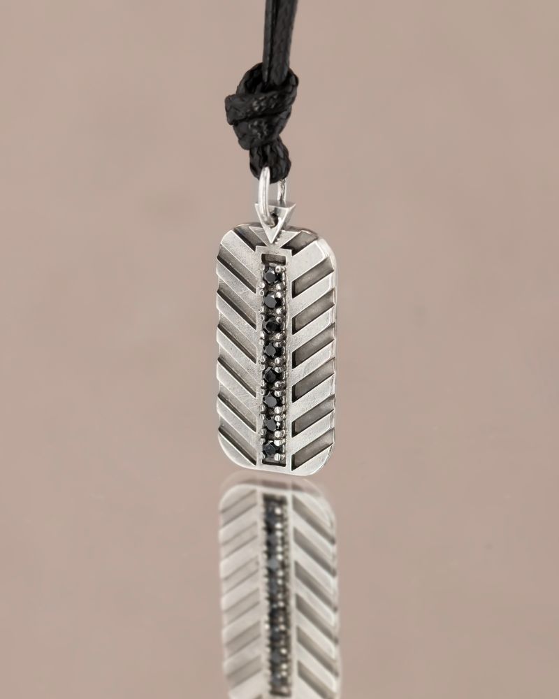 Pandantivul PRIMUS este creat pentru barbatii care prefera o estetica puternica, moderna si clara. Elementul central este arhitectural, cu un design simetric, construit din aur alb 14K si finisat cu rodiu negru pentru un contrast intens. Liniile geometrice sunt accentuate de un sir vertical de diamante negre naturale.