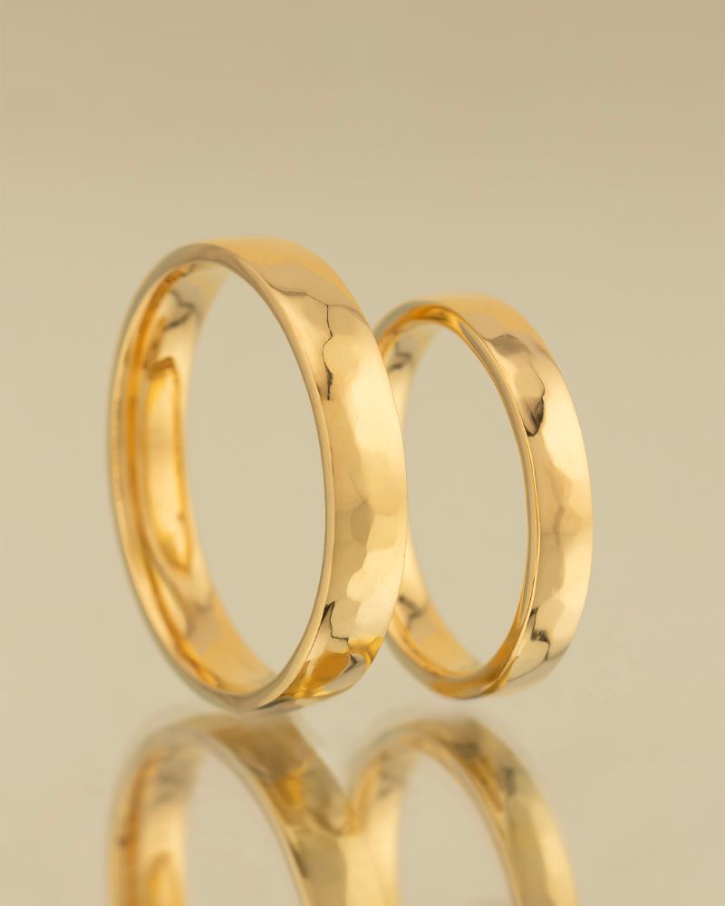 Verighetele OUR JOURNEY sunt semi-bombate la exterior si cu finisaj lucios, cu lovituri de ciocan. Sunt verighete late si cu confort interior.
